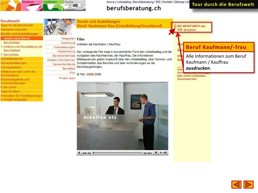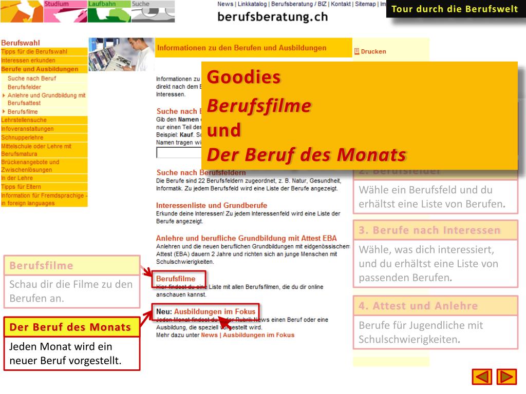 Tour durch die Berufswelt Goodies 4 Möglichkeiten der Berufssuche Berufsfilme und Der Beruf des Monats 1. Direkt-Suche nach Beruf Gib einen Teil des Berufsnamens ein und klicke auf suchen. 2. Berufsfelder Wähle ein Berufsfeld und du erhältst eine Liste von Berufen. 3. Berufe nach Interessen Wähle, was dich interessiert, und du erhältst eine Liste von passenden Berufen. Berufsfilme Berufsfilme Schau dir die Filme zu den Berufen an. 4. Attest und Anlehre Berufe für Jugendliche mit Schulschwierigkeiten. Der Beruf des Monats Jeden Monat wird ein neuer Beruf vorgestellt.
