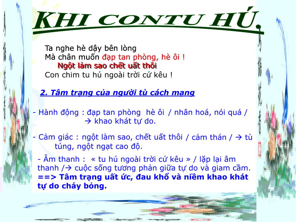 KHI CONTU HÚ. Ta nghe hè dậy bên lòng Mà chân muốn đạp tan phòng, hè ôi ! Ngột lảm sao chết uất thôi Con chim tu hú ngoài trời cứ kêu ! Ta nghe hè dậy bên lòng Mà chân muốn đạp tan phòng, hè ôi ! Ngột lảm sao chết uất thôi 2. Tâm trạng của người tù cách mạng - Hành động : / nhân hoá, nói quá / khao khát tự do. đạp tan phòng hè ôi - Cảm giác : ngột làm sao, chết uất thôi / cảm thán / tù túng, ngột ngạt cao độ. - Âm thanh : « tu hú ngoài trời cứ kêu » / lặp lại âm thanh / cuộc sống tương phản giữa tự do và giam cầm. ==> Tâm trạng uất ức, đau khổ và niềm khao khát tự do cháy bỏng.