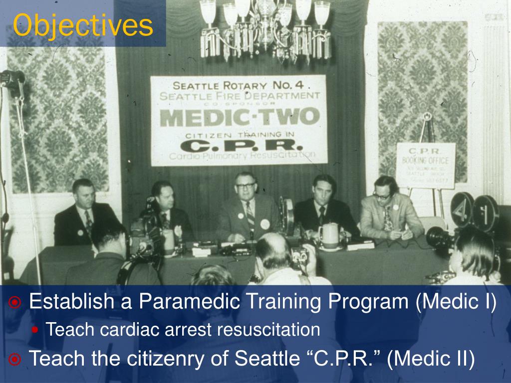 Objectives • Establish a Paramedic Training Program (Medic I) • Teach cardiac arrest resuscitation • Teach the citizenry of Seattle “C.P.R.” (Medic II)