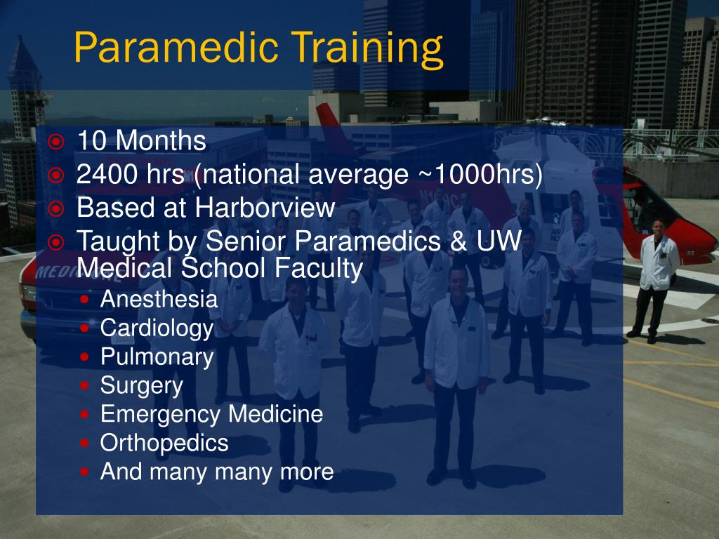 Paramedic Training • 10 Months • 2400 hrs (national average ~1000hrs) • Based at Harborview • Taught by Senior Paramedics & UW Medical School Faculty • Anesthesia • Cardiology • Pulmonary • Surgery • Emergency Medicine • Orthopedics • And many many more