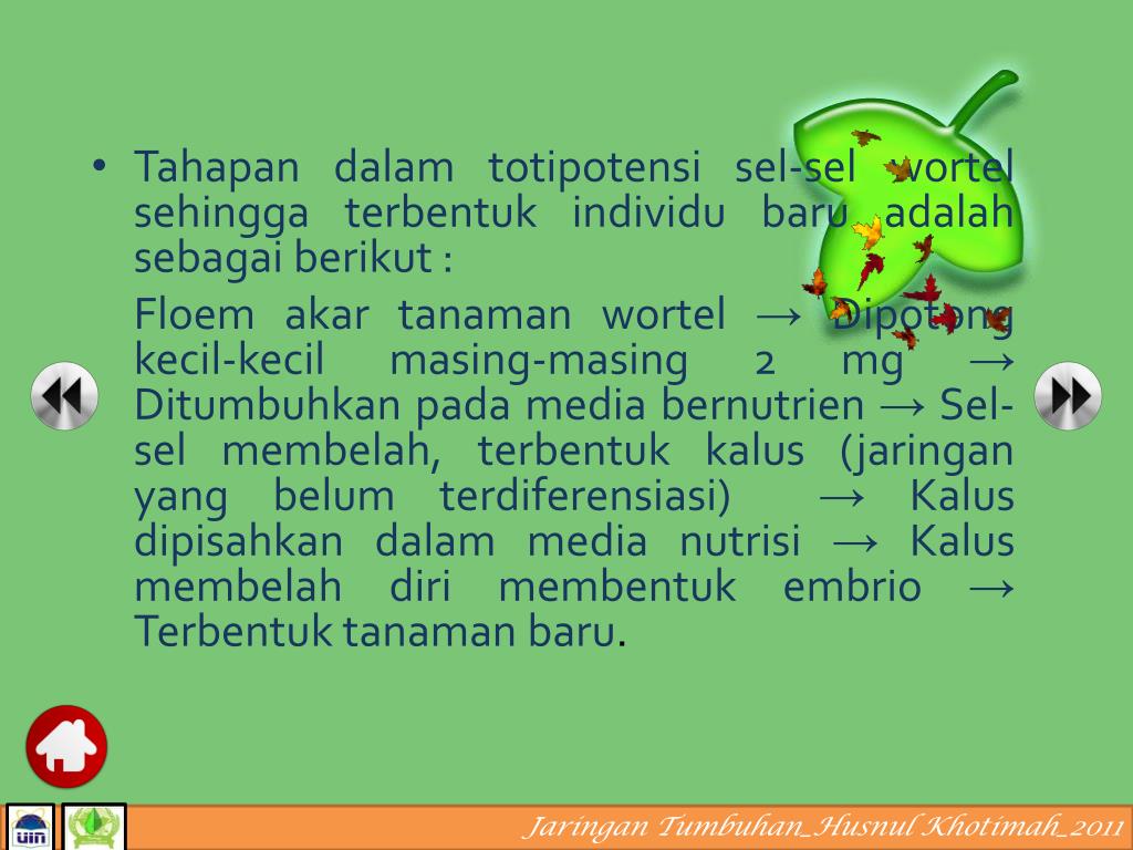 Hubungan sifat totipotensi jaringan pada teknologi kultur jaringan • Totipotensi adalah kemampuan beberapa sel yang dapat tumbuh membentuk suatu individu. • Sifat totipotensi jaringan pertama kali ditemukan oleh F.C. Steward (1958). Saat itu, ia melihat sifat totipotensi pada jaringan floem dari akar tanaman wortel.