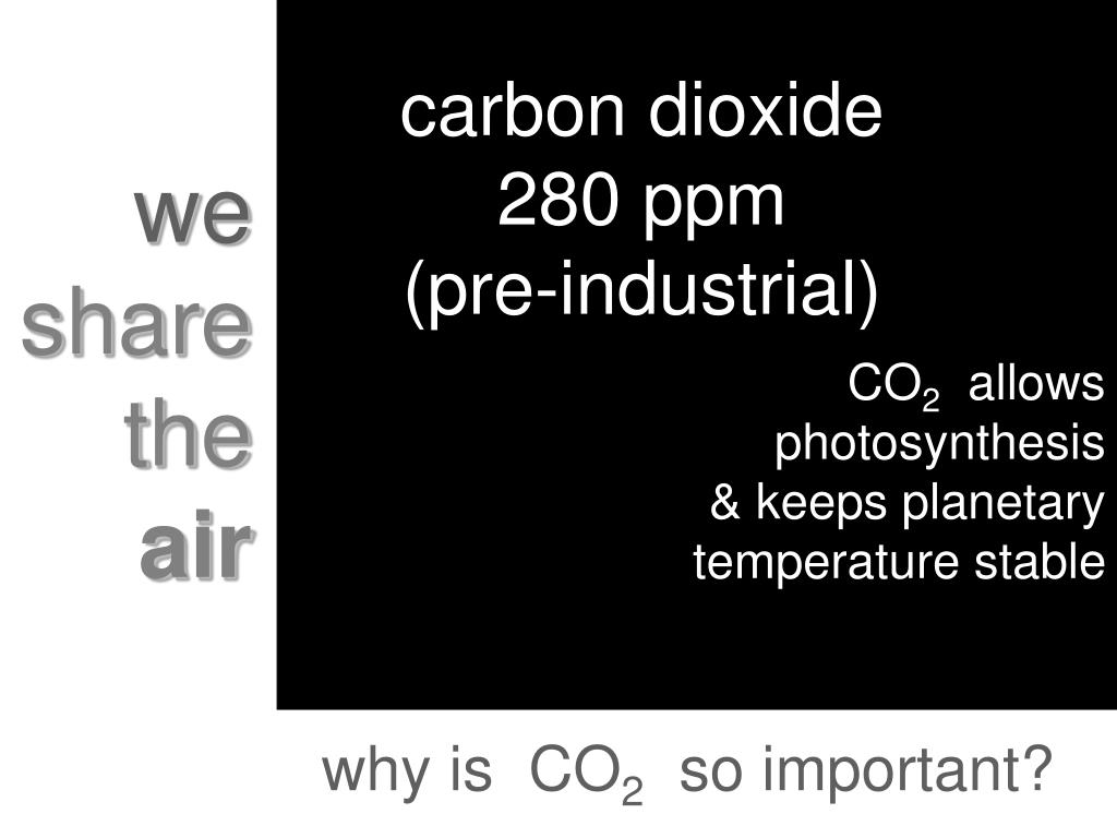 carbon dioxide 280 ppm (pre-industrial) we share the air CO2 allows photosynthesis & keeps planetary temperature stable why is CO2 so important?