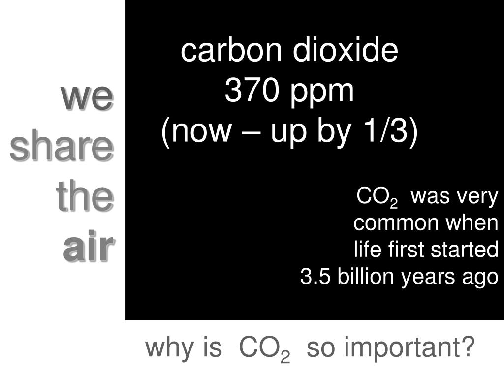 carbon dioxide 370 ppm (now – up by 1/3) we share the air CO2 was very common when life first started 3.5 billion years ago why is CO2 so important?