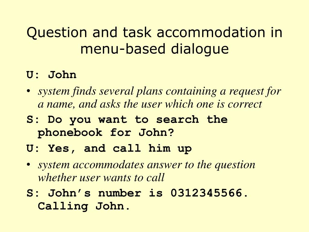Question and task accommodation in menu-based dialogue U: John • system finds several plans containing a request for a name, and asks the user which one is correct S: Do you want to search the phonebook for John? U: Yes, and call him up • system accommodates answer to the question whether user wants to call S: John’s number is 0312345566. Calling John.