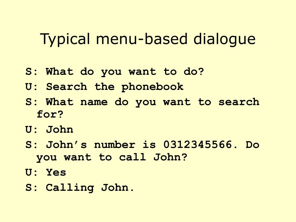 Typical menu-based dialogue S: What do you want to do? U: Search the phonebook S: What name do you want to search for? U: John S: John’s number is 0312345566. Do you want to call John? U: Yes S: Calling John.