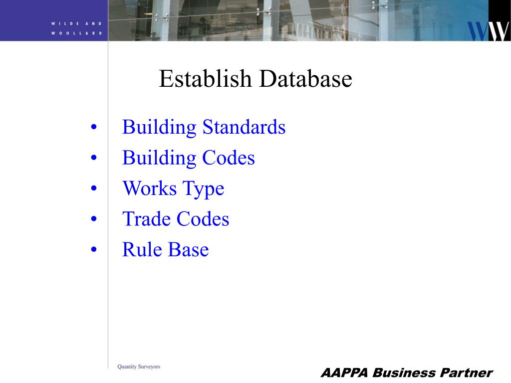 Establish Database • Building Standards • Building Codes • Works Type • Trade Codes • Rule Base AAPPA Business Partner