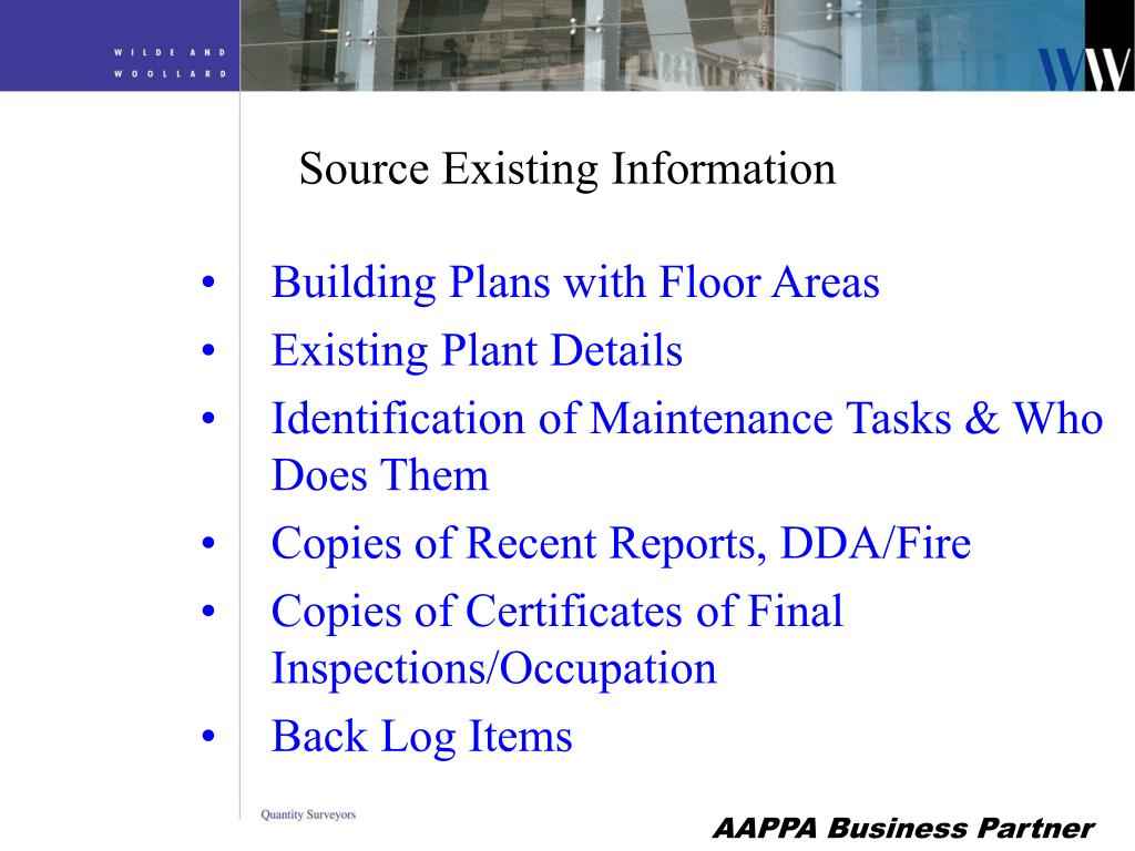 Source Existing Information • Building Plans with Floor Areas • Existing Plant Details • Identification of Maintenance Tasks & Who Does Them • Copies of Recent Reports, DDA/Fire • Copies of Certificates of Final Inspections/Occupation • Back Log Items AAPPA Business Partner