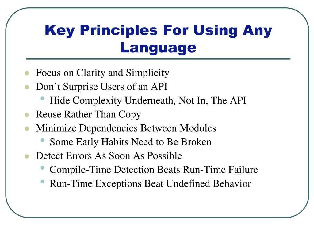 Focus on Clarity and Simplicity Don’t Surprise Users of an API Hide Complexity Underneath, Not In, The API Reuse Rather Than Copy Minimize Dependencies Between Modules Some Early Habits Need to Be Broken Detect Errors As Soon As Possible Compile-Time Detection Beats Run-Time Failure Run-Time Exceptions Beat Undefined Behavior Key Principles For Using Any Language
