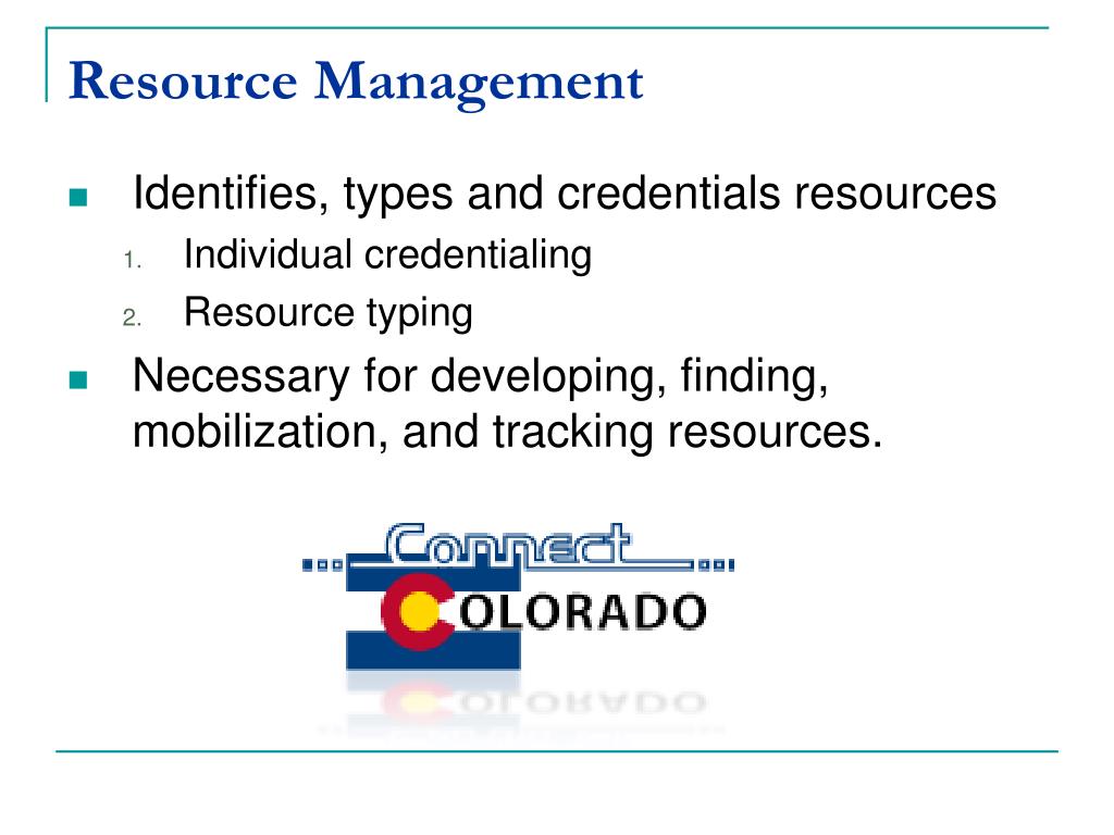 Resource Management Identifies, types and credentials resources Individual credentialing Resource typing Necessary for developing, finding, mobilization, and tracking resources.