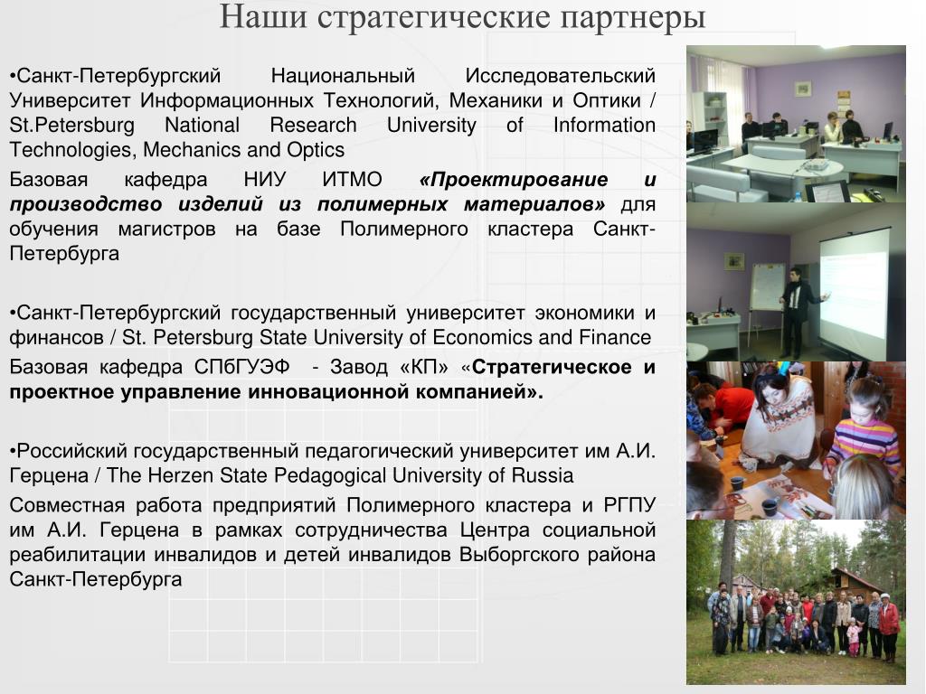 Наши стратегические партнеры Санкт-Петербургский Национальный Исследовательский Университет Информационных Технологий, Механики и Оптики / St.Petersburg National Research University of Information Technologies, Mechanics and Optics Базовая кафедра НИУ ИТМО «Проектирование и производство изделий из полимерных материалов» для обучения магистров на базе Полимерного кластера Санкт-Петербурга Санкт-Петербургский государственный университет экономики и финансов / St. Petersburg State University of Economics and Finance Базовая кафедра СПбГУЭФ - Завод «КП» «Стратегическое и проектное управление инновационной компанией». Российский государственный педагогический университет им А.И. Герцена / The Herzen State Pedagogical University of Russia Совместная работа предприятий Полимерного кластера и РГПУ им А.И. Герцена в рамках сотрудничества Центра социальной реабилитации инвалидов и детей инвалидов Выборгского района Санкт-Петербурга