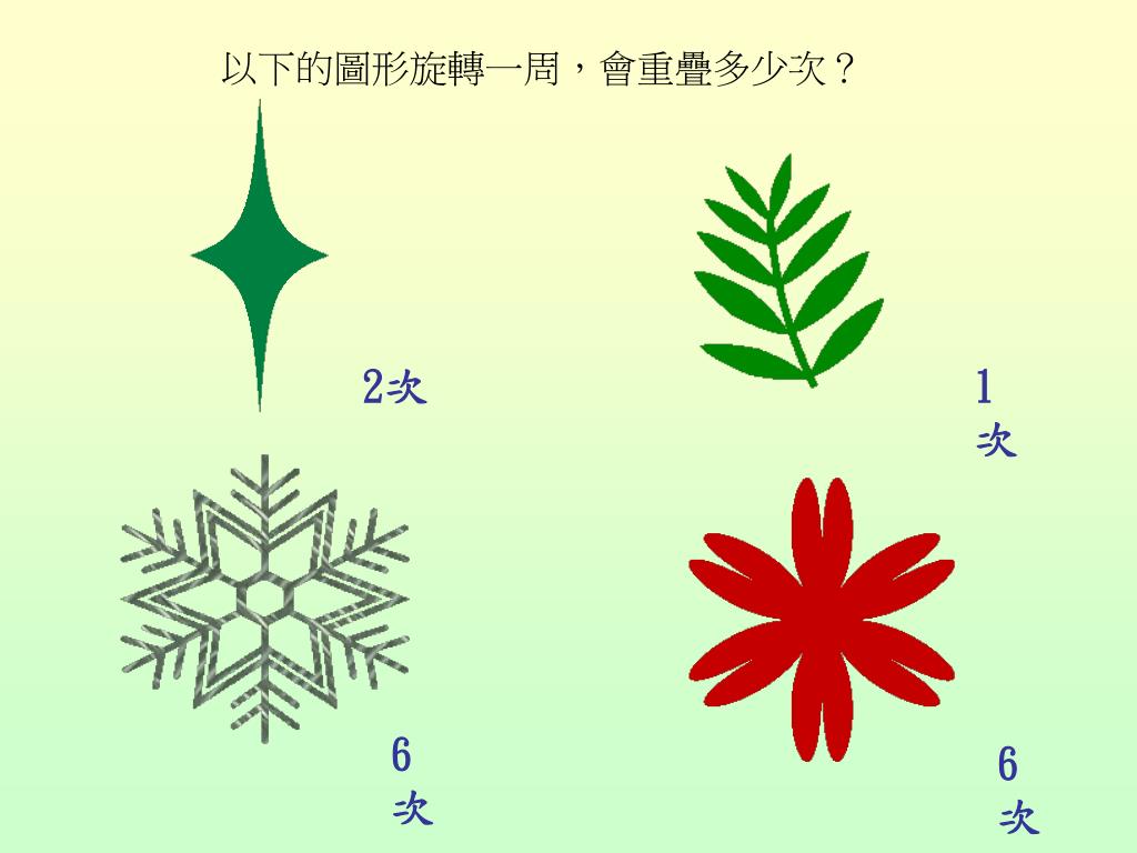 把這個圖形旋轉一周,會重疊多少次? 4 次 旋轉90o 1次 旋轉180o 2 次 旋轉270o 3 次 旋轉360o 4次 1 4 2 1 1 3 1
