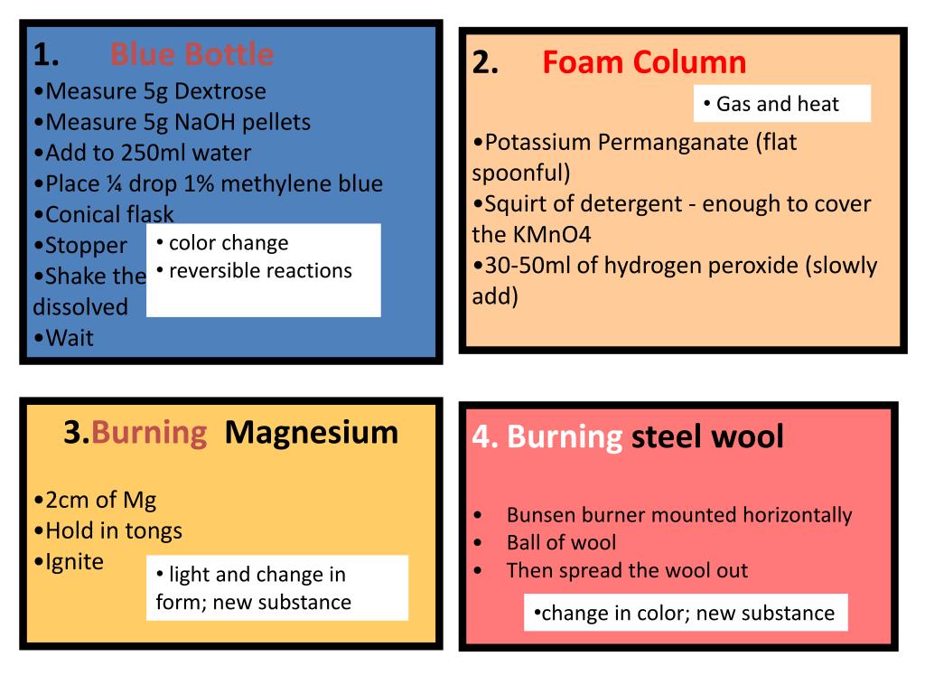 1. Blue Bottle • Measure 5g Dextrose • Measure 5g NaOH pellets • Add to 250ml water • Place ¼ drop 1% methylene blue • Conical flask • Stopper • Shake the flask until NaOH is dissolved • Wait • 2.Foam Column • Potassium Permanganate (flat spoonful) • Squirt of detergent - enough to cover the KMnO4 • 30-50ml of hydrogen peroxide (slowly add) • Gas and heat • color change • reversible reactions • 3.BurningMagnesium • 2cm of Mg • Hold in tongs • Ignite • Burningsteel wool • Bunsen burner mounted horizontally • Ball of wool • Then spread the wool out • light and change in form; new substance • change in color; new substance