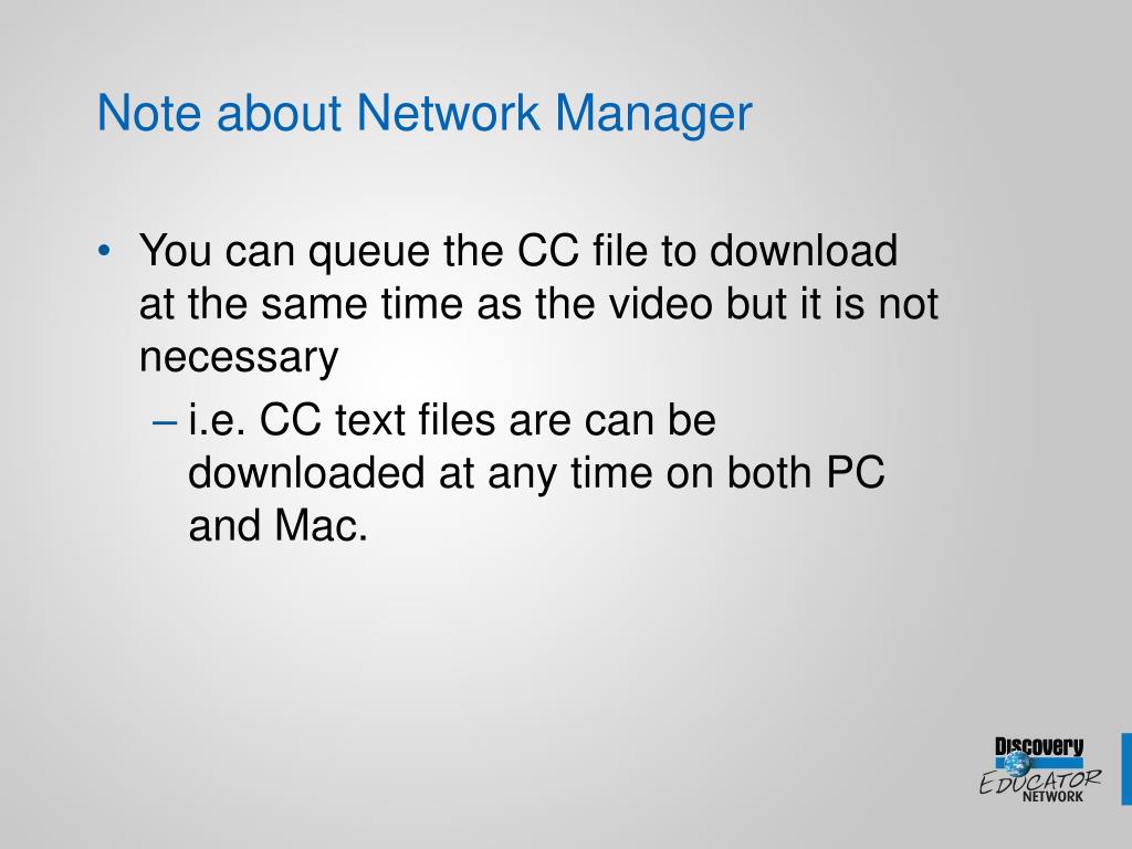 Note about Network Manager • You can queue the CC file to download at the same time as the video but it is not necessary • i.e. CC text files are can be downloaded at any time on both PC and Mac.