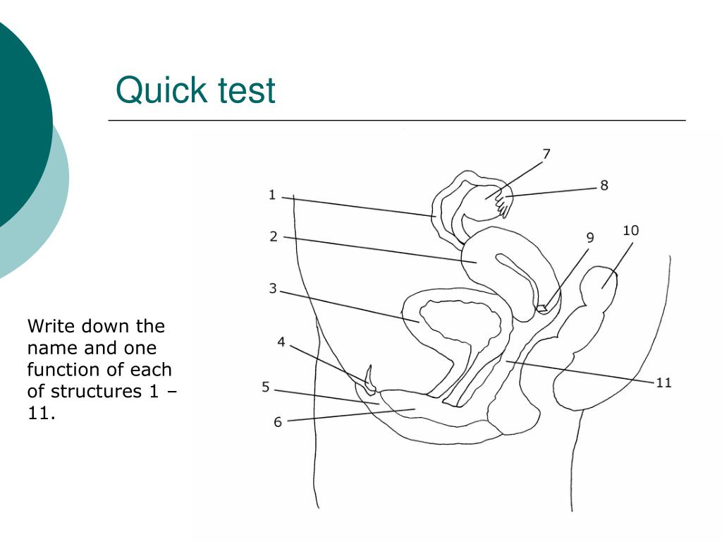 Quick test Write down the name and one function of each of structures 1 – 11.