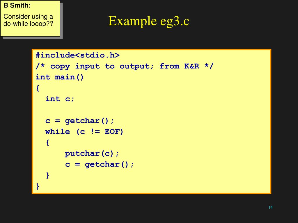 B Smith: Consider using a do-while looop?? Example eg3.c #include<stdio.h> /* copy input to output; from K&R */ int main() { int c; c = getchar(); while (c != EOF) { putchar(c); c = getchar(); } }