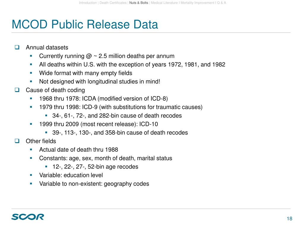 Introduction| Death Certificates | Nuts & Bolts | Medical Literature I Mortality Improvement I Q & A MCOD Public Release Data • Annual datasets • Currently running @ ~ 2.5 million deaths per annum • All deaths within U.S. with the exception of years 1972, 1981, and 1982 • Wide format with many empty fields • Not designed with longitudinal studies in mind! • Cause of death coding • 1968 thru 1978: ICDA (modified version of ICD-8) • 1979 thru 1998: ICD-9 (with substitutions for traumatic causes) • 34-, 61-, 72-, and 282-bin cause of death recodes • 1999 thru 2009 (most recent release): ICD-10 • 39-, 113-, 130-, and 358-bin cause of death recodes • Other fields • Actual date of death thru 1988 • Constants: age, sex, month of death, marital status • 12-, 22-, 27-, 52-bin age recodes • Variable: education level • Variable to non-existent: geography codes