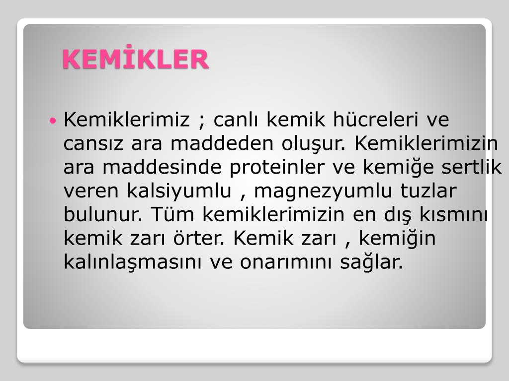 Kemiklerimiz ; canlı kemik hücreleri ve cansız ara maddeden oluşur. Kemiklerimizin ara maddesinde proteinler ve kemiğe sertlik veren kalsiyumlu , magnezyumlu tuzlar bulunur. Tüm kemiklerimizin en dış kısmını kemik zarı örter. Kemik zarı , kemiğin kalınlaşmasını ve onarımını sağlar. KEMİKLER