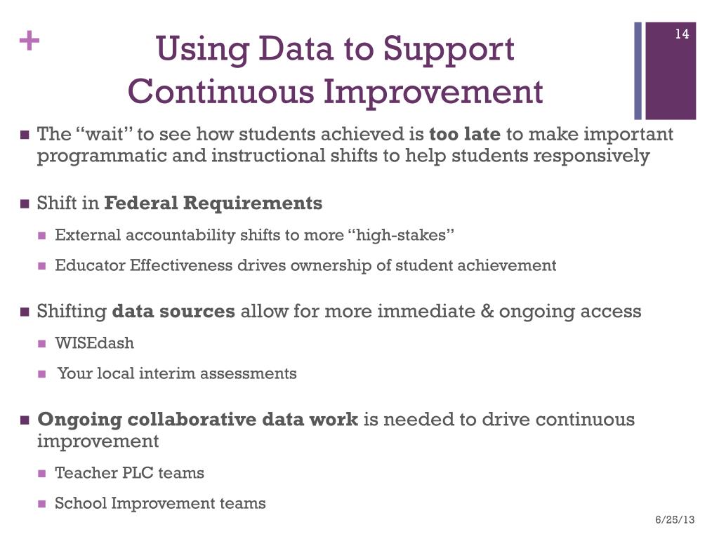 Using Data to Support Continuous Improvement • The “wait” to see how students achieved is too late to make important programmatic and instructional shifts to help students responsively • Shift in Federal Requirements • External accountability shifts to more “high-stakes” • Educator Effectiveness drives ownership of student achievement • Shifting data sources allow for more immediate & ongoing access • WISEdash • Your local interim assessments • Ongoing collaborative data work is needed to drive continuous improvement • Teacher PLC teams • School Improvement teams