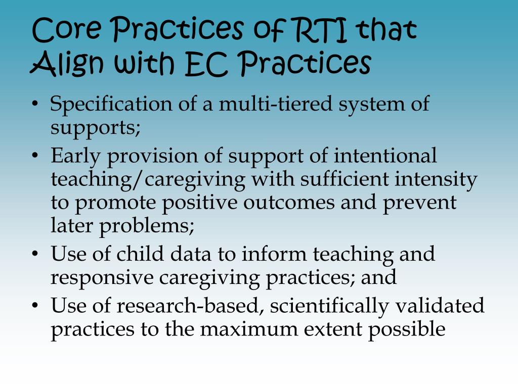 Core Practices of RTI that Align with EC Practices • Specification of a multi-tiered system of supports; • Early provision of support of intentional teaching/caregiving with sufficient intensity to promote positive outcomes and prevent later problems; • Use of child data to inform teaching and responsive caregiving practices; and • Use of research-based, scientifically validated practices to the maximum extent possible
