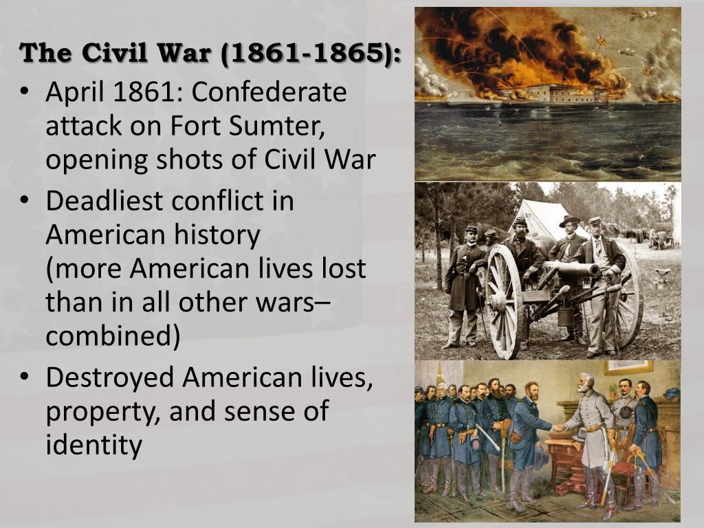 The Civil War (1861-1865): • April 1861: Confederate attack on Fort Sumter, opening shots of Civil War • Deadliest conflict in American history (more American lives lost than in all other wars– combined) • Destroyed American lives, property, and sense of identity
