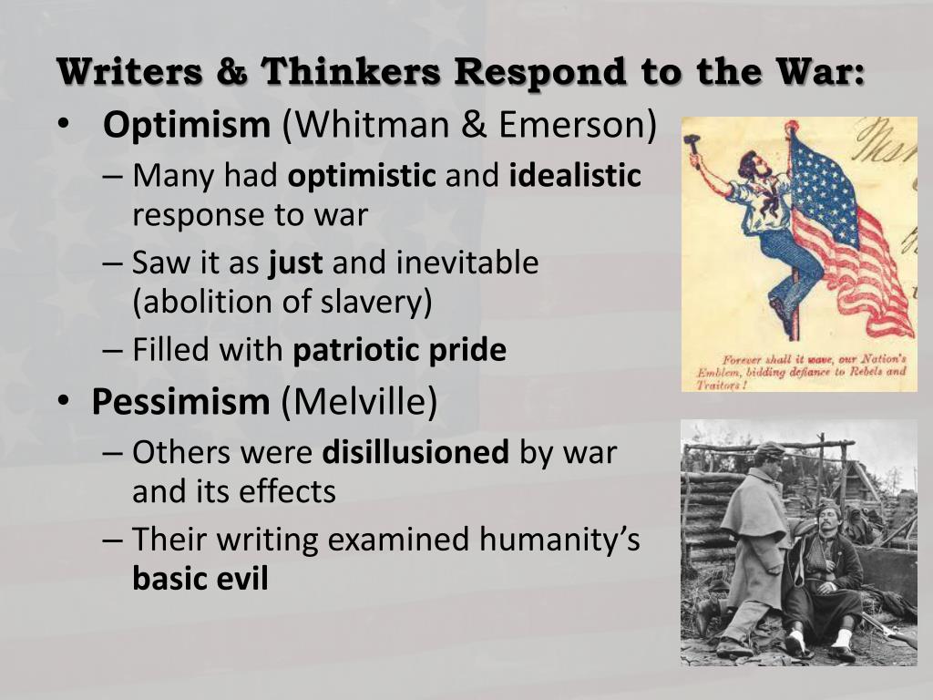 Writers & Thinkers Respond to the War: • Optimism (Whitman & Emerson) • Many had optimisticand idealisticresponse to war • Saw it as just and inevitable (abolition of slavery) • Filled with patriotic pride • Pessimism (Melville) • Others were disillusionedby war and its effects • Their writing examined humanity’s basic evil