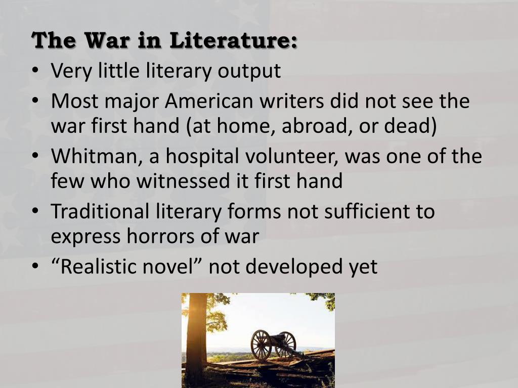 The War in Literature: • Very little literary output • Most major American writers did not see the war first hand (at home, abroad, or dead) • Whitman, a hospital volunteer, was one of the few who witnessed it first hand • Traditional literary forms not sufficient to express horrors of war • “Realistic novel” not developed yet