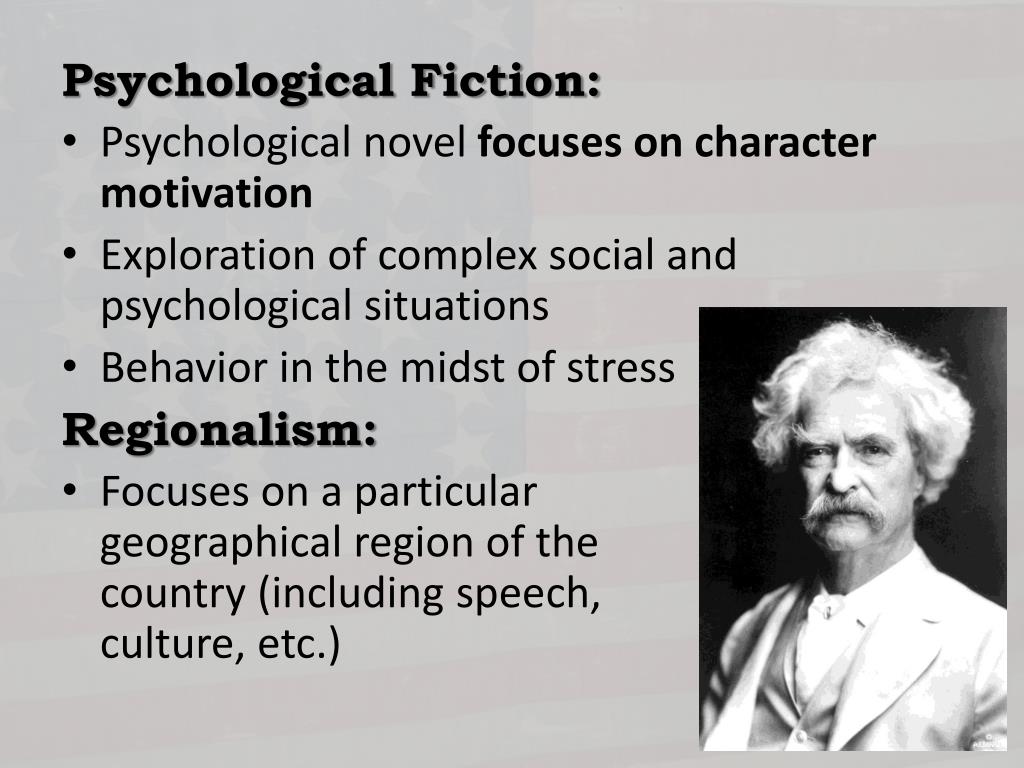 Psychological Fiction: • Psychological novel focuses on character motivation • Exploration of complex social and psychological situations • Behavior in the midst of stress Regionalism: • Focuses on a particular geographical region of the country (including speech, culture, etc.)