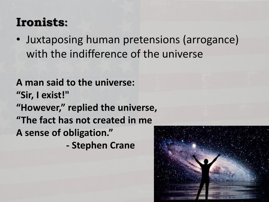 Ironists: • Juxtaposing human pretensions (arrogance) with the indifference of the universe A man said to the universe: “Sir, I exist!" “However,” replied the universe, “The fact has not created in me A sense of obligation.” - Stephen Crane
