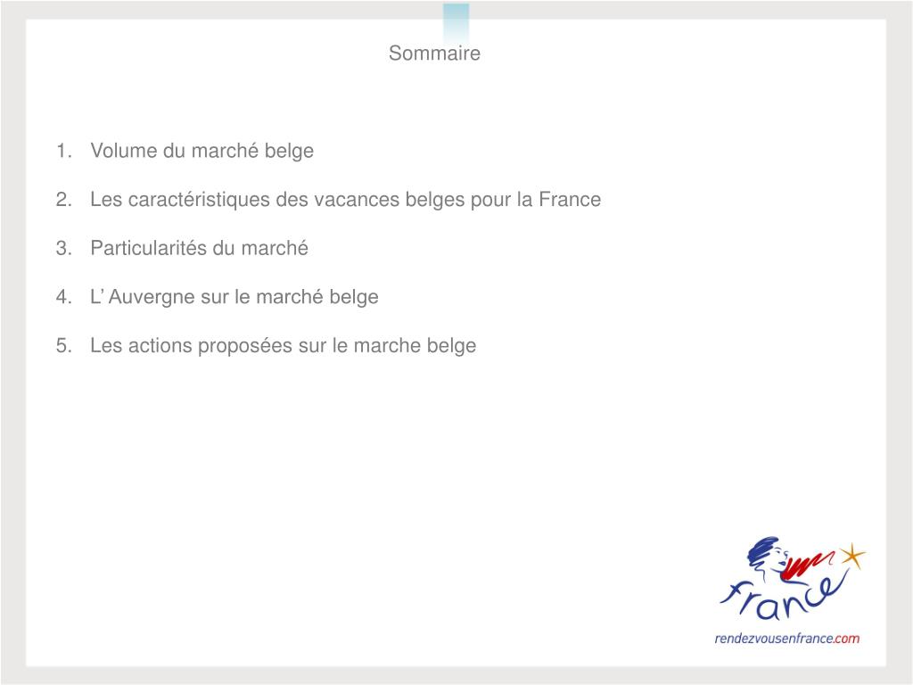 Sommaire Volume du marché belge Les caractéristiques des vacances belges pour la France Particularités du marché L’ Auvergne sur le marché belge Les actions proposées sur le marche belge