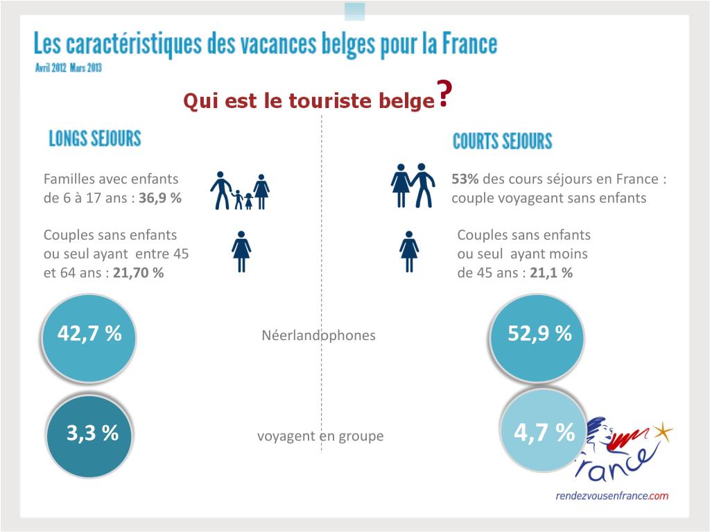 ? Familles avec enfants de 6 à 17 ans : 36,9 % 53% des cours séjours en France : couple voyageant sans enfants Couples sans enfants ou seul ayant entre 45 et 64 ans : 21,70 % Couples sans enfants ou seul ayant moins de 45 ans : 21,1 % 52,9 % 42,7 % Néerlandophones 4,7 % 3,3 % voyagent en groupe