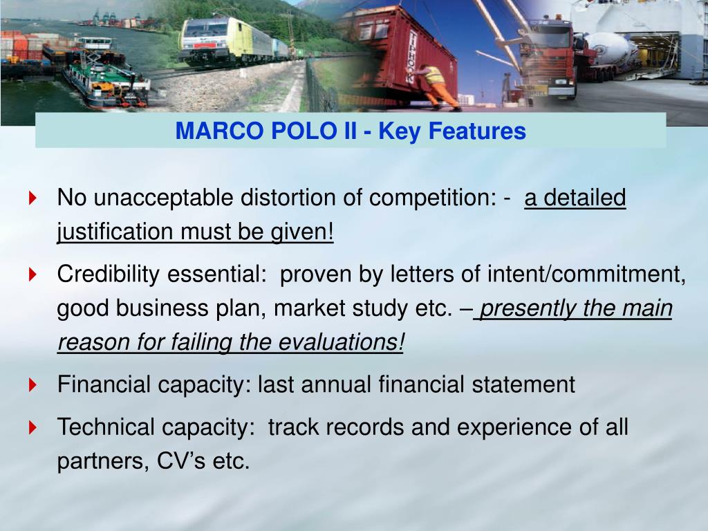 MARCO POLO II - Key Features • No unacceptable distortion of competition: - a detailed justification must be given! • Credibility essential: proven by letters of intent/commitment, good business plan, market study etc. –presently the main reason for failing the evaluations! • Financial capacity: last annual financial statement • Technical capacity: track records and experience of all partners, CV’s etc.