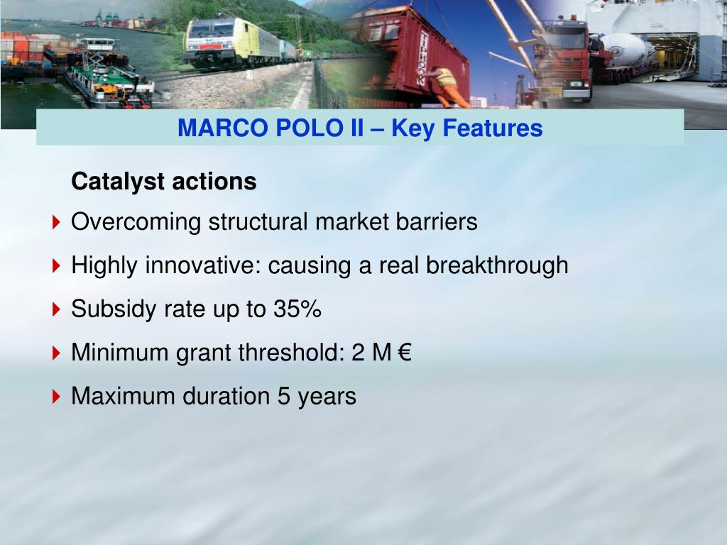 Catalyst actions Overcoming structural market barriers Highly innovative: causing a real breakthrough Subsidy rate up to 35% Minimum grant threshold: 2 M € Maximum duration 5 years MARCO POLO II – Key Features