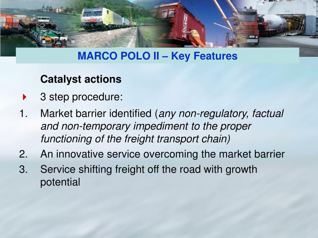 Catalyst actions 3 step procedure: Market barrier identified (any non-regulatory, factual and non-temporary impediment to the proper functioning of the freight transport chain) An innovative service overcoming the market barrier Service shifting freight off the road with growth potential MARCO POLO II – Key Features