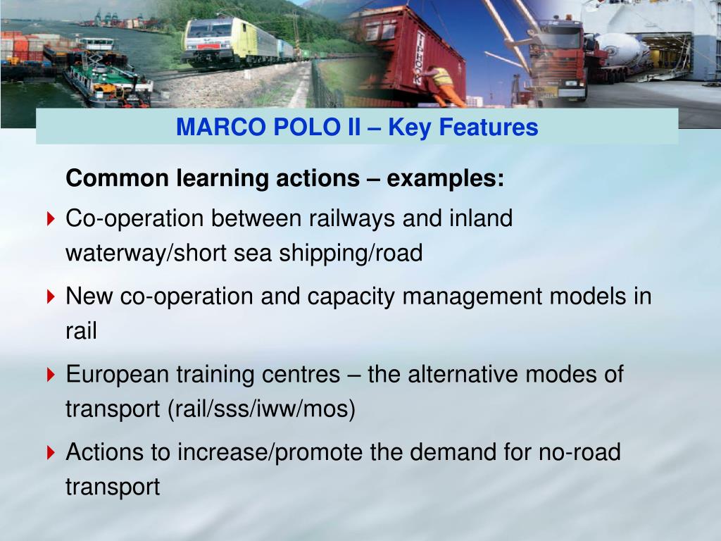 Common learning actions – examples: Co-operation between railways and inland waterway/short sea shipping/road New co-operation and capacity management models in rail European training centres – the alternative modes of transport (rail/sss/iww/mos) Actions to increase/promote the demand for no-road transport MARCO POLO II – Key Features