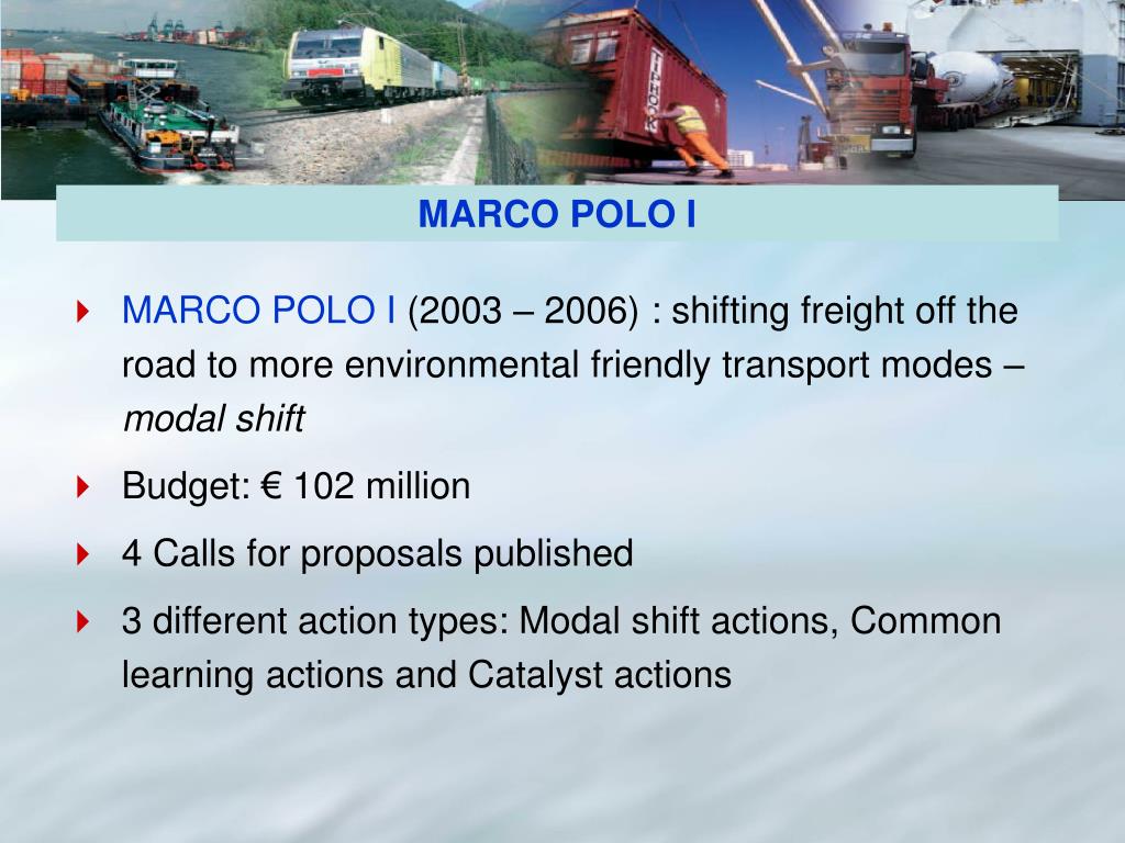 MARCO POLO I • MARCO POLO I (2003 – 2006) : shifting freight off the road to more environmental friendly transport modes – modal shift • Budget: € 102 million • 4 Calls for proposals published • 3 different action types: Modal shift actions, Common learning actions and Catalyst actions