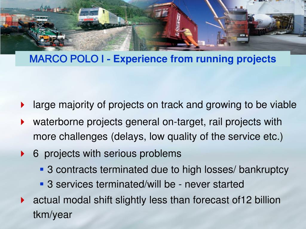 MARCO POLO I -Experience from running projects • large majority of projects on track and growing to be viable • waterborne projects general on-target, rail projects with more challenges (delays, low quality of the service etc.) • 6 projects with serious problems • 3 contracts terminated due to high losses/ bankruptcy • 3 services terminated/will be - never started • actual modal shift slightly less than forecast of12 billion tkm/year