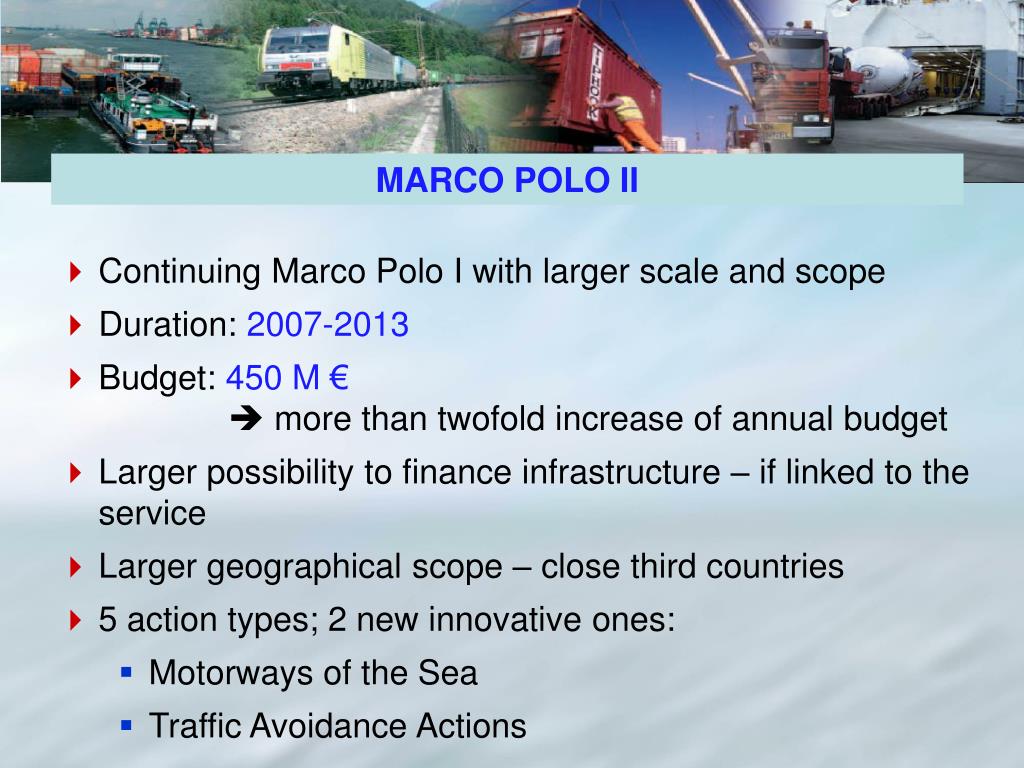 MARCO POLO II • Continuing Marco Polo I with larger scale and scope • Duration: 2007-2013 • Budget: 450 M € more than twofold increase of annual budget • Larger possibility to finance infrastructure – if linked to the service • Larger geographical scope – close third countries • 5 action types; 2 new innovative ones: • Motorways of the Sea • Traffic Avoidance Actions