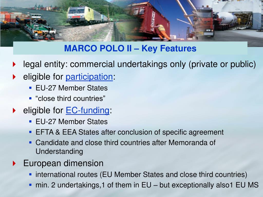 MARCO POLO II – Key Features • legal entity: commercial undertakings only (private or public) • eligible for participation: • EU-27 Member States • “close third countries” • eligible for EC-funding: • EU-27 Member States • EFTA & EEA States after conclusion of specific agreement • Candidate and close third countries after Memoranda of Understanding • European dimension • international routes (EU Member States and close third countries) • min. 2 undertakings,1 of them in EU – but exceptionally also1 EU MS