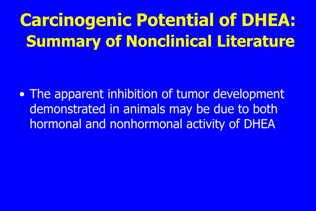 Carcinogenic Potential of DHEA:Summary of Nonclinical Literature • The apparent inhibition of tumor development demonstrated in animals may be due to both hormonal and nonhormonal activity of DHEA