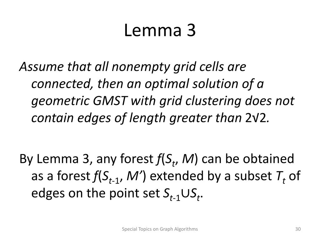 Lemma 3 Assume that all nonempty grid cells are connected, then an optimal solution of a geometric GMST with grid clustering does not contain edges of length greater than 2√2. By Lemma 3, any forest f(St, M) can be obtained as a forest f(St-1, M’) extended by a subset Tt of edges on the point set St-1∪St. Special Topics on Graph Algorithms