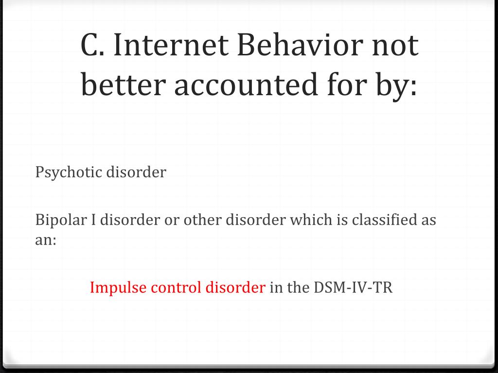 C. Internet Behavior not better accounted for by: Psychotic disorder Bipolar I disorder or other disorder which is classified as an: Impulse control disorder in the DSM-IV-TR