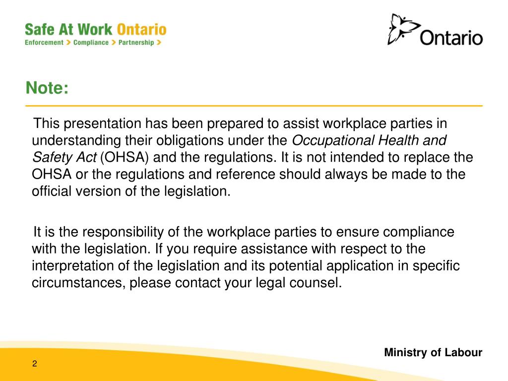 Note: • This presentation has been prepared to assist workplace parties in understanding their obligations under the Occupational Health and Safety Act (OHSA) and the regulations. It is not intended to replace the OHSA or the regulations and reference should always be made to the official version of the legislation. • It is the responsibility of the workplace parties to ensure compliance with the legislation. If you require assistance with respect to the interpretation of the legislation and its potential application in specific circumstances, please contact your legal counsel.