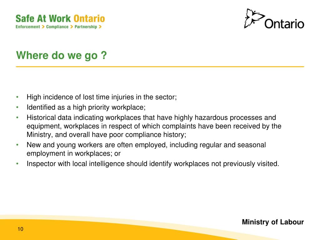 Where do we go ? • High incidence of lost time injuries in the sector; • Identified as a high priority workplace; • Historical data indicating workplaces that have highly hazardous processes and equipment, workplaces in respect of which complaints have been received by the Ministry, and overall have poor compliance history; • New and young workers are often employed, including regular and seasonal employment in workplaces; or • Inspector with local intelligence should identify workplaces not previously visited.