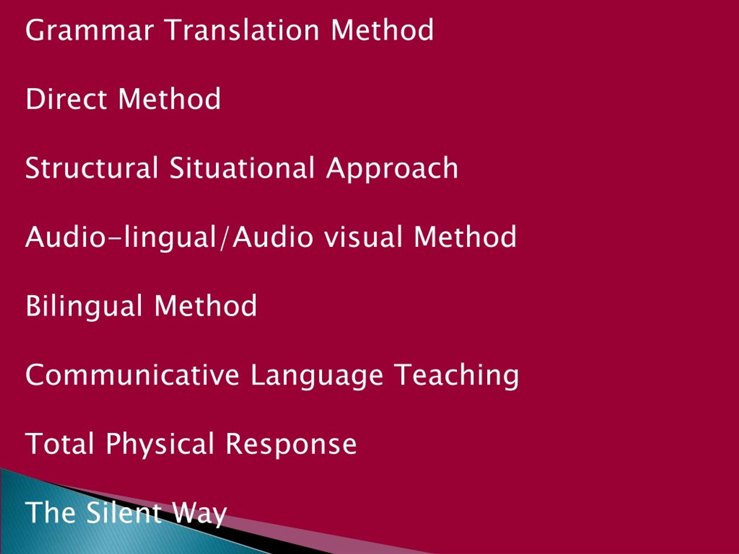 Grammar Translation Method Direct Method Structural Situational Approach Audio-lingual/Audio visual Method Bilingual Method Communicative Language Teaching Total Physical Response The Silent Way