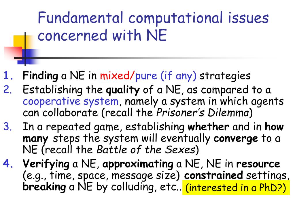 Fundamental computational issues concerned with NE • Finding a NE in mixed/pure (if any) strategies • Establishing the quality of a NE, as compared to a cooperative system, namely a system in which agents can collaborate (recall the Prisoner’s Dilemma) • In a repeated game, establishing whether and in how many steps the system will eventually converge to a NE (recall the Battle of the Sexes) • Verifying a NE, approximating a NE, NE in resource (e.g., time, space, message size) constrained settings, breaking a NE by colluding, etc... (interested in a PhD?)