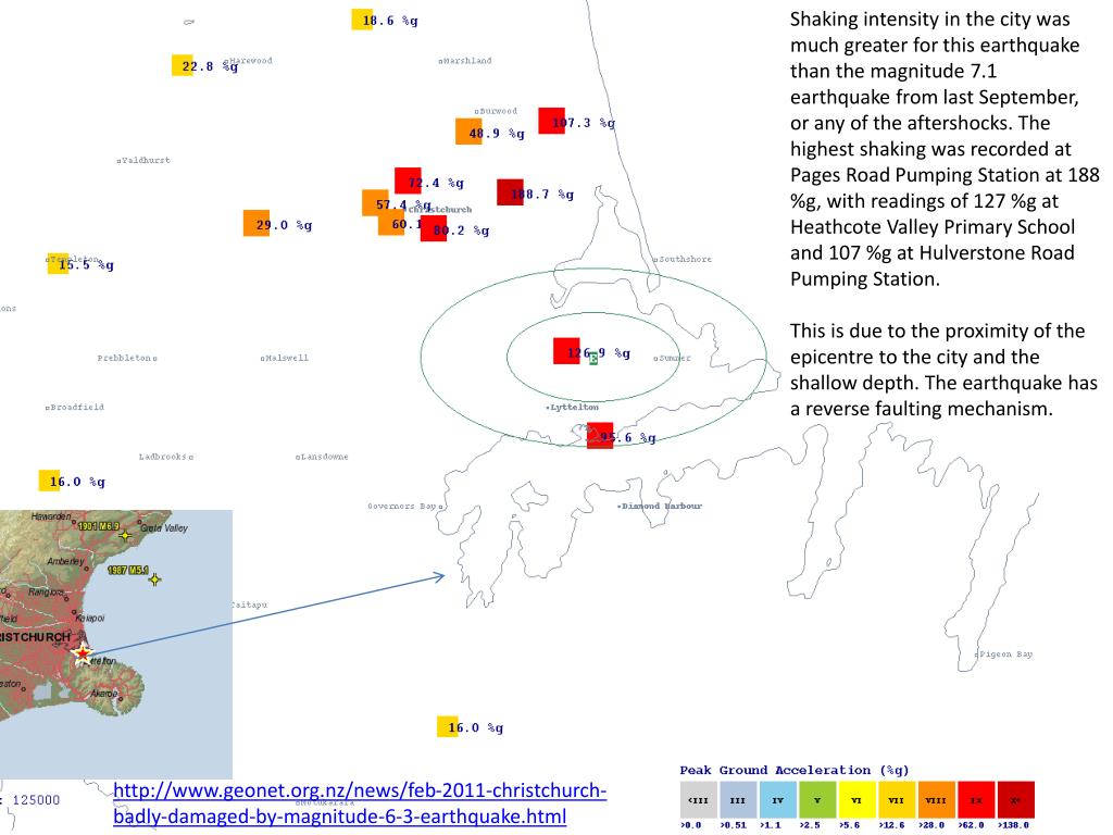 Shaking intensity in the city was much greater for this earthquake than the magnitude 7.1 earthquake from last September, or any of the aftershocks. The highest shaking was recorded at Pages Road Pumping Station at 188 %g, with readings of 127 %g at Heathcote Valley Primary School and 107 %g at Hulverstone Road Pumping Station. This is due to the proximity of the epicentre to the city and the shallow depth. The earthquake has a reverse faulting mechanism. http://www.geonet.org.nz/news/feb-2011-christchurch-badly-damaged-by-magnitude-6-3-earthquake.html