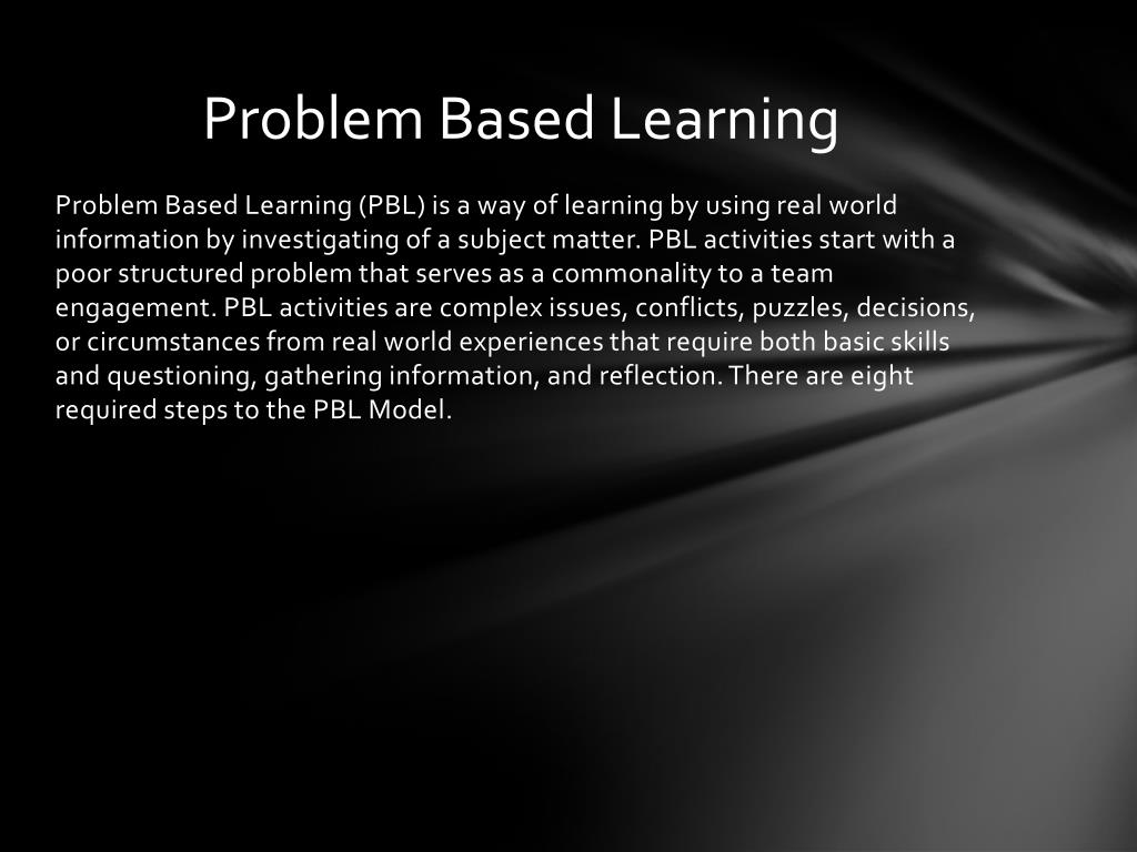 Problem Based Learning • Problem Based Learning (PBL) is a way of learning by using real world information by investigating of a subject matter. PBL activities start with a poor structured problem that serves as a commonality to a team engagement. PBL activities are complex issues, conflicts, puzzles, decisions, or circumstances from real world experiences that require both basic skills and questioning, gathering information, and reflection. There are eight required steps to the PBL Model.