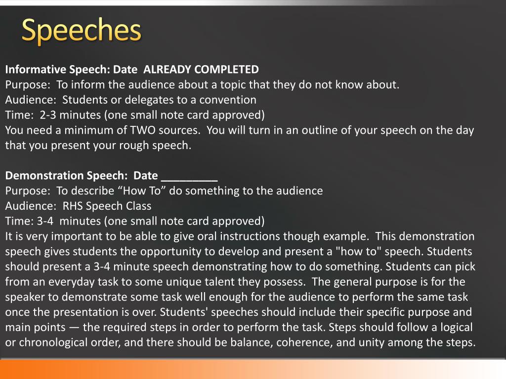 Speeches Informative Speech: Date ALREADY COMPLETED Purpose: To inform the audience about a topic that they do not know about.Audience: Students or delegates to a conventionTime: 2-3 minutes (one small note card approved) You need a minimum of TWO sources. You will turn in an outline of your speech on the day that you present your rough speech. Demonstration Speech: Date _________ Purpose: To describe “How To” do something to the audienceAudience: RHS Speech ClassTime: 3-4 minutes (one small note card approved) It is very important to be able to give oral instructions though example. This demonstration speech gives students the opportunity to develop and present a "how to" speech. Students should present a 3-4 minute speech demonstrating how to do something. Students can pick from an everyday task to some unique talent they possess. The general purpose is for the speaker to demonstrate some task well enough for the audience to perform the same task once the presentation is over. Students' speeches should include their specific purpose and main points — the required steps in order to perform the task. Steps should follow a logical or chronological order, and there should be balance, coherence, and unity among the steps.