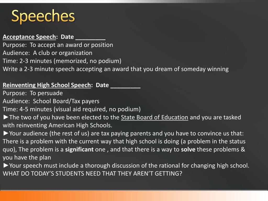 Speeches • Acceptance Speech: Date _________ • Purpose: To accept an award or positionAudience: A club or organizationTime: 2-3 minutes (memorized, no podium) • Write a 2-3 minute speech accepting an award that you dream of someday winning • Reinventing High School Speech: Date _________ • Purpose: To persuadeAudience: School Board/Tax payersTime: 4-5 minutes (visual aid required, no podium) • ►The two of you have been elected to the State Board of Education and you are tasked with reinventing American High Schools.►Your audience (the rest of us) are tax paying parents and you have to convince us that: • There is a problem with the current way that high school is doing (a problem in the status quo), The problem is a significant one , and that there is a way to solve these problems & you have the plan • ►Your speech must include a thorough discussion of the rational for changing high school. WHAT DO TODAY’S STUDENTS NEED THAT THEY AREN’T GETTING?