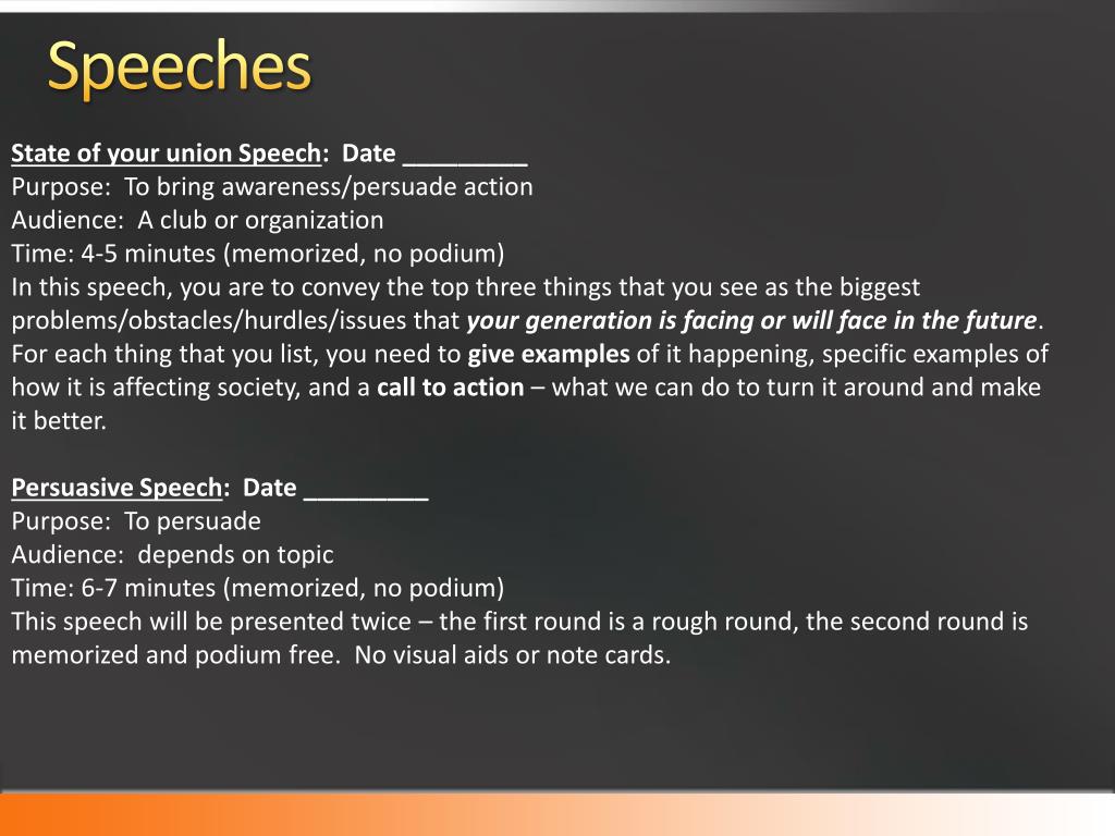 Speeches State of your union Speech: Date _________ Purpose: To bring awareness/persuade actionAudience: A club or organizationTime: 4-5 minutes (memorized, no podium) In this speech, you are to convey the top three things that you see as the biggest problems/obstacles/hurdles/issues that your generation is facing or will face in the future. For each thing that you list, you need to give examples of it happening, specific examples of how it is affecting society, and a call to action – what we can do to turn it around and make it better. Persuasive Speech: Date _________ Purpose: To persuadeAudience: depends on topicTime: 6-7 minutes (memorized, no podium) This speech will be presented twice – the first round is a rough round, the second round is memorized and podium free. No visual aids or note cards.
